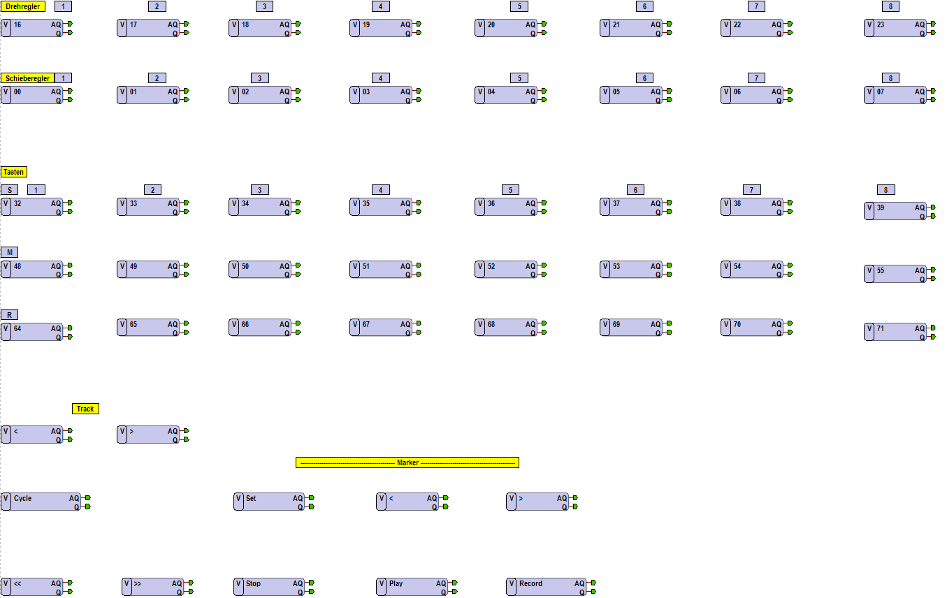 Die Tasten senden jeweils den Wert 0 bzw. 127 (gedrückt, 0x7F), die Dreh- und Schieberegler von 0 bis 127.